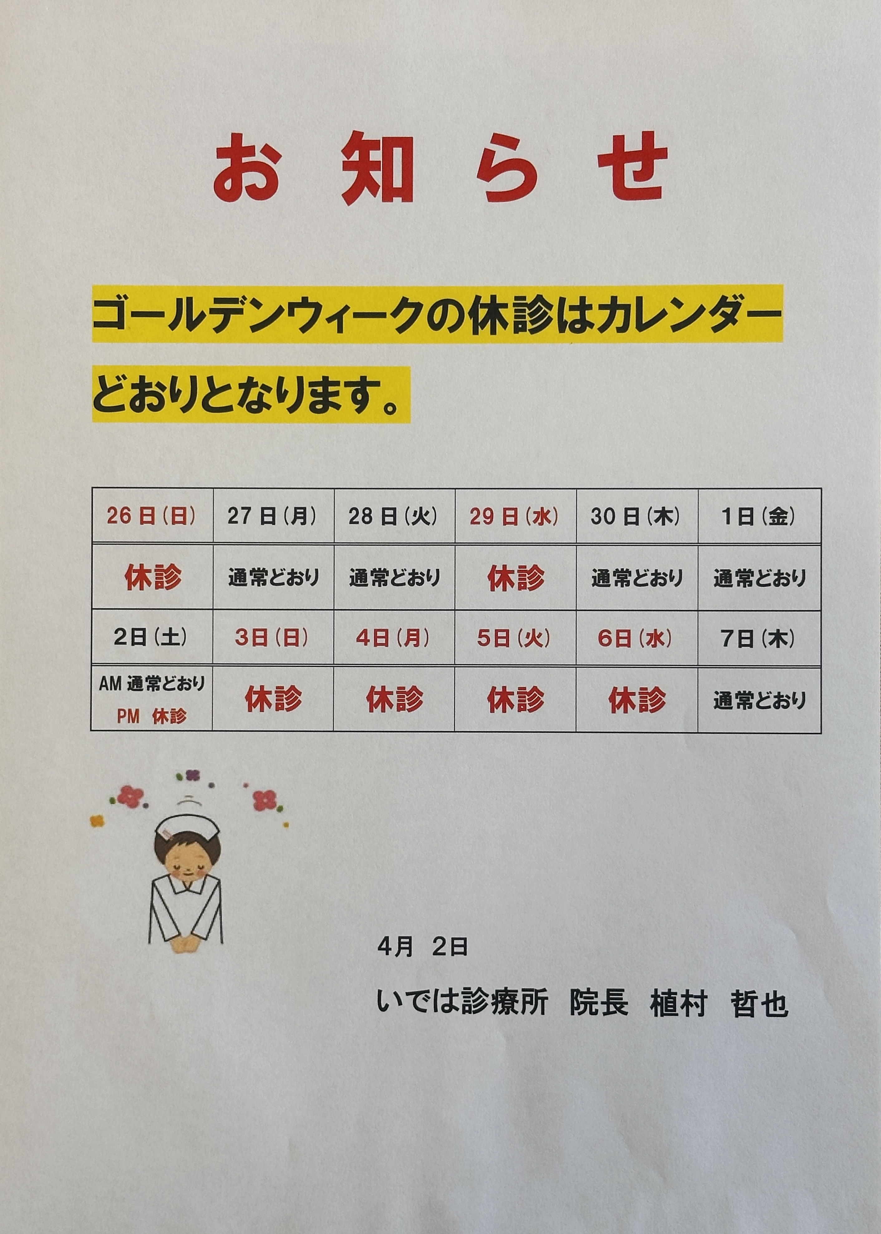 ゴールデンウィークの休診はカレンダーどおりとなります。