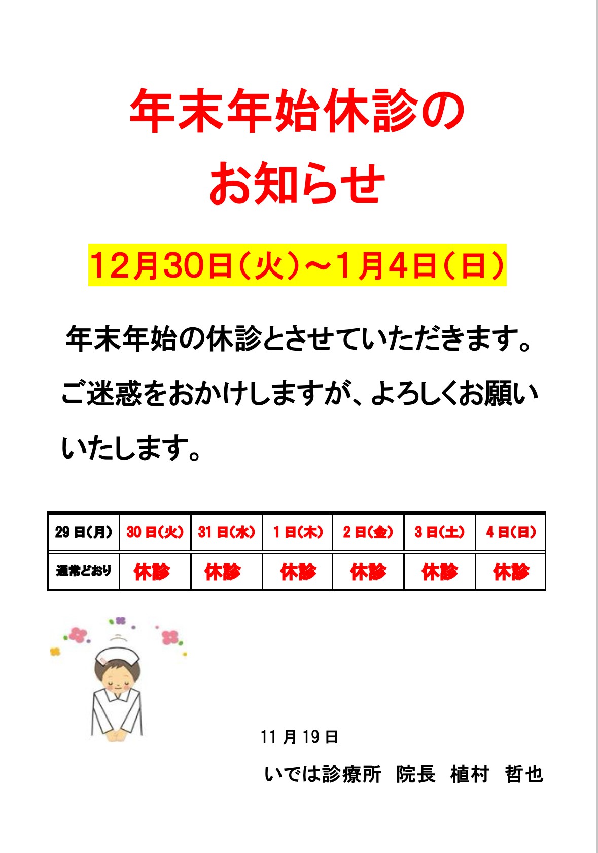 R7.12月30日(火)~R8.1月4日(日)まで、年末年始休診とさせていただきます。